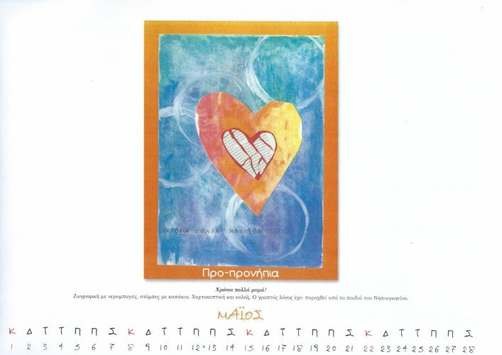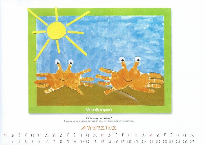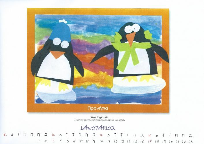 Μαζί με την εικαστικό μας κυρία Βασιλική Κλιάφα - Πάτρα τα παιδιά δούλεψαν ομαδικά (ανά ηλικία) με διαφορετικά υλικά και τεχνοτροπίες σύμφωνα πάντα με τις δυνατότητες τους δημιουργώντας ένα ιδιαίτερο ημερολόγιο του οποίου τα έσοδα θα διατεθούν υπέρ των σκοπών της ΑΜΥΜΩΝΗΣ (www.amimoni.gr)